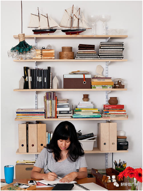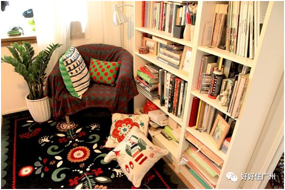 家里有一片大书架,书籍的质感以及上面摆放的物件(如旅游纪念品,明信片等)可以有效的传达温馨感~
