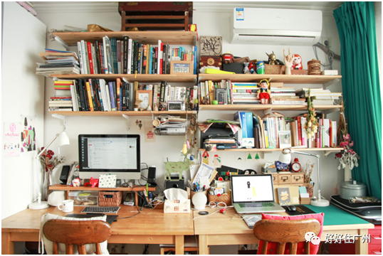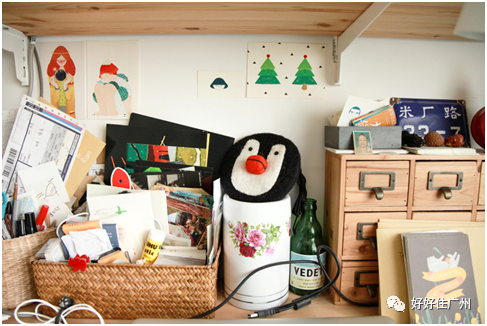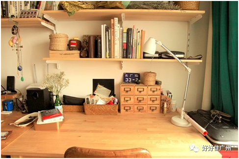因为我们两个人都是自由职业,因此,在一个一居室的小空间里,是必须有一个工作区的,来放置画册,书,画笔,零碎的小物件等。