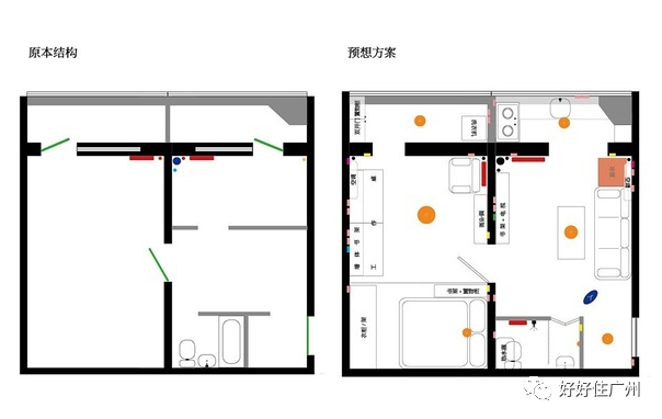 下面左右图为原先的户型图以及设计师帮我们规划之后的图(南向):