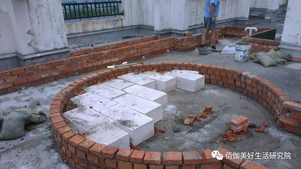 这个休闲平台上面要铺防腐木的,用很多剩余的轻质砖填充到圆圈内,一切以尽量减轻楼顶重量为目标。