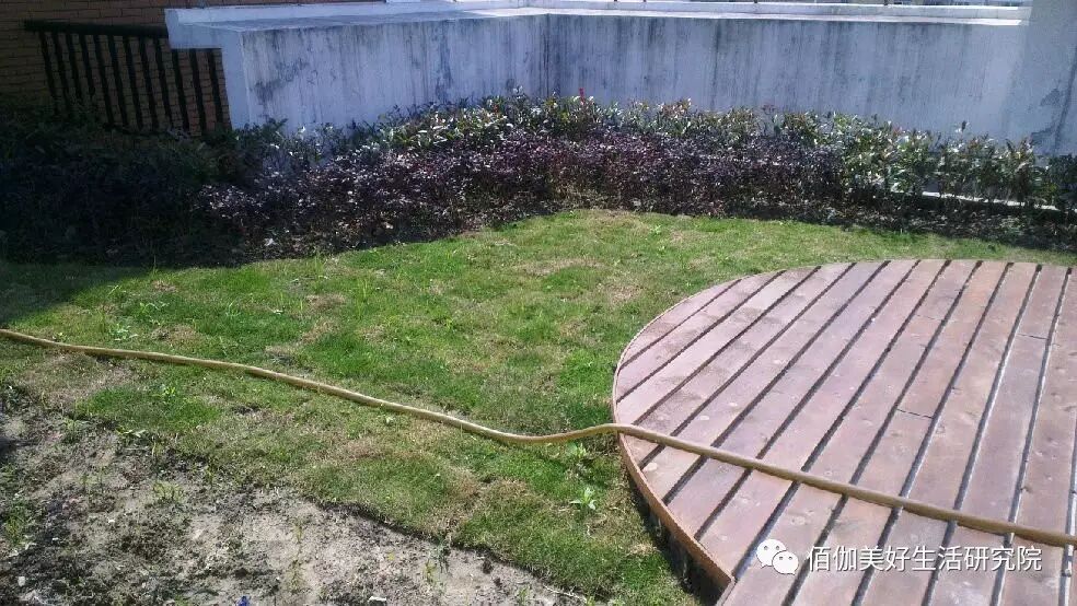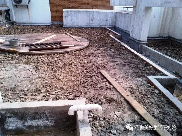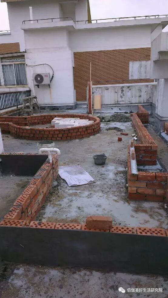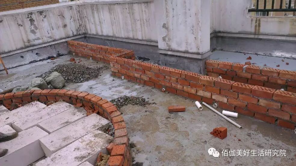 首先根据确定好的方案在休闲平台区域砌一个三十公分高的平台,再将种植区域和下水管沟渠之间砌30公分,注意每隔一小段就会留一个出水口,这样以后泥土里多余的水就从出水口直接排入下水沟渠。