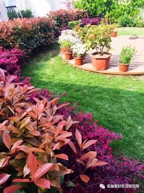 3)红花槭木,四季常紫,矮小的灌木,春天的时候开满玫红小花,整团的玫红色也非常漂亮。