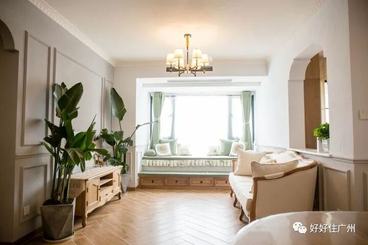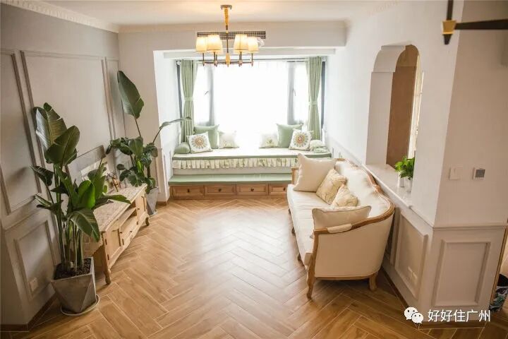 窗洞位于全家正中心,视线能360°旋转,纵览玄关厨房到客厅飘窗再到阳台绿植,位置绝佳。