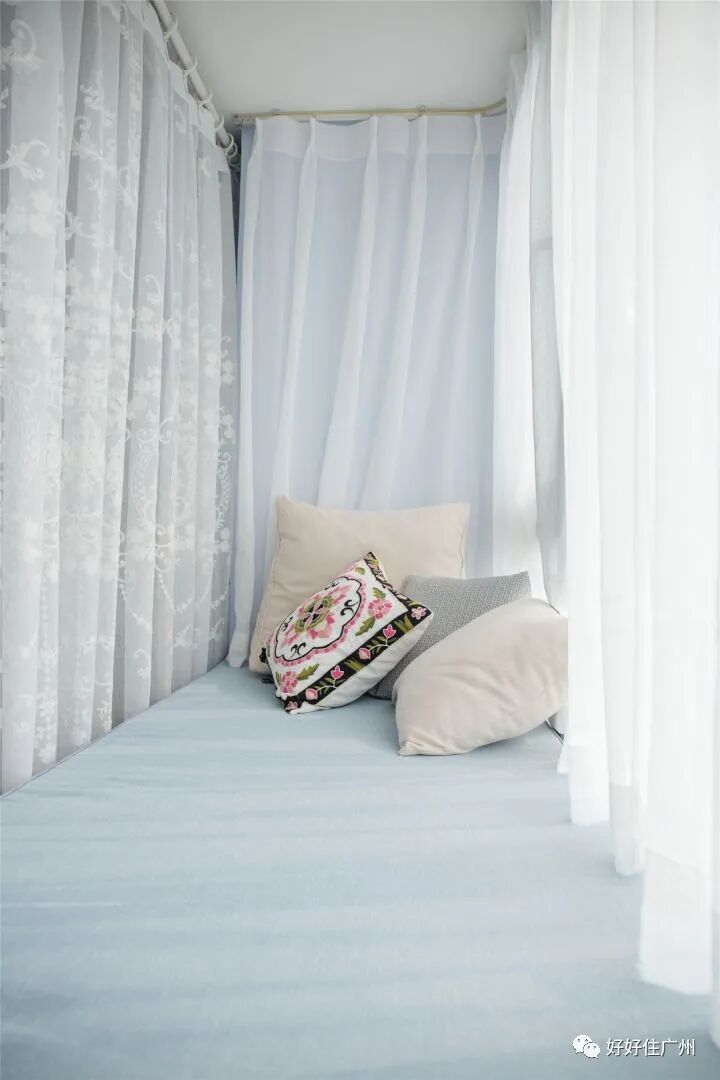 如何营造梦幻的飘窗效果?外侧轨道挂一层U型白纱,内侧罗马杆挂一层刺绣白纱加一层浅蓝遮光布。