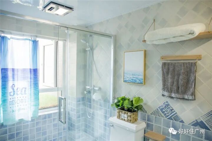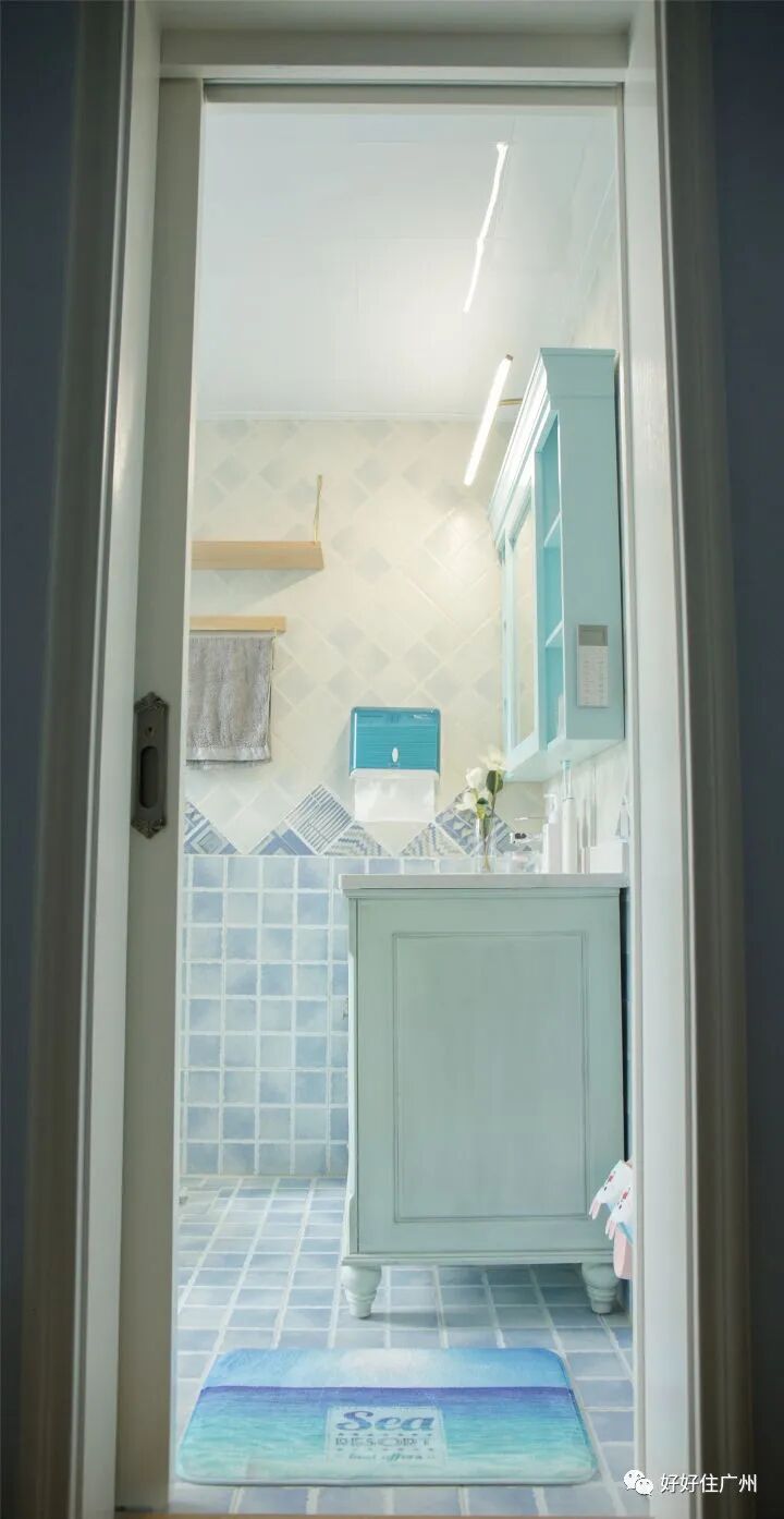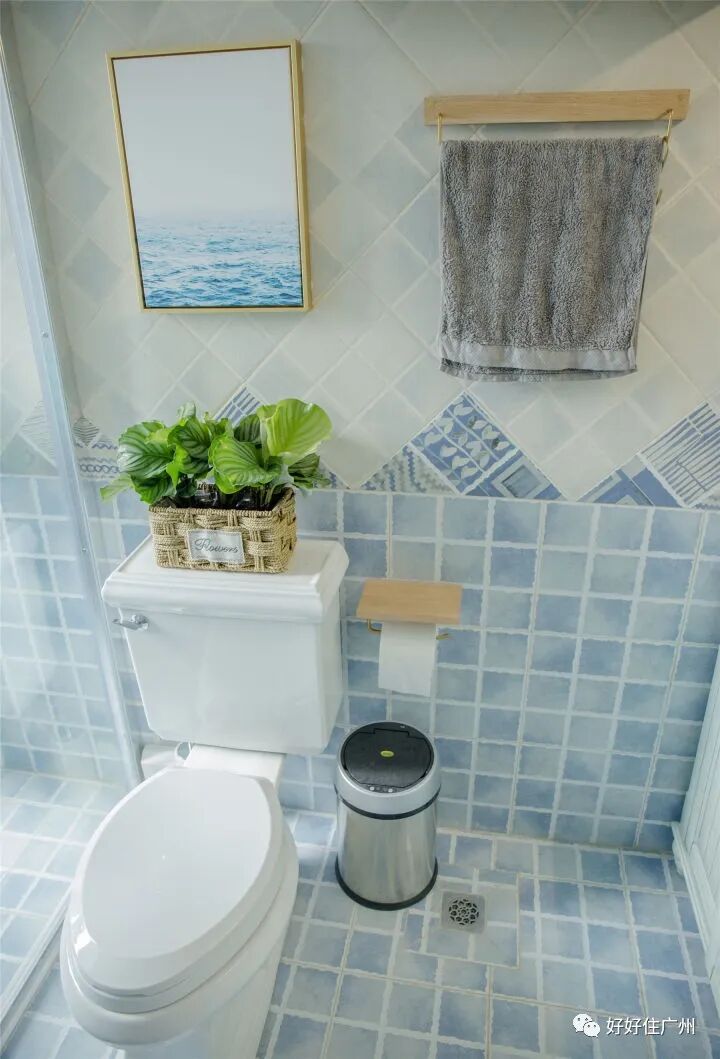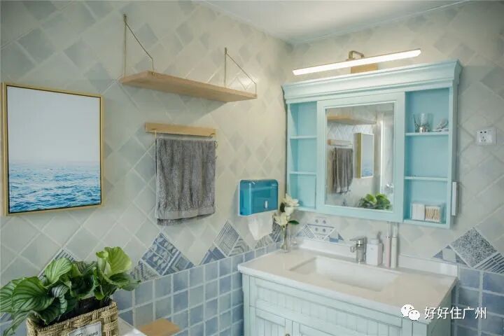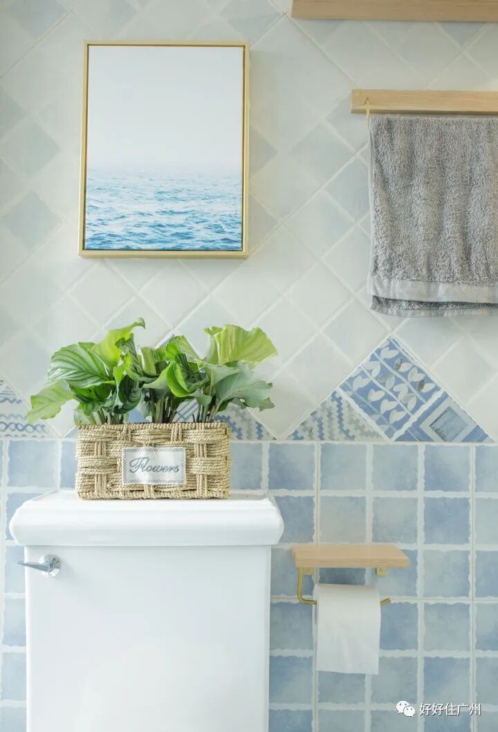 浴室柜、纸巾盒、乃至装饰画,都延续蓝色搭配。