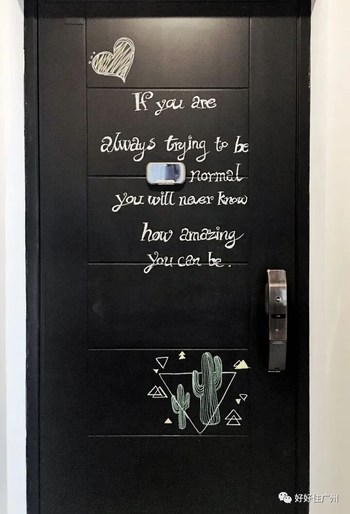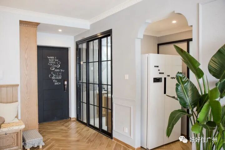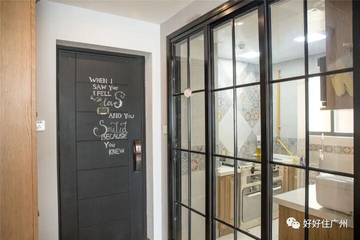 厨房用黑框玻璃门,和入户门黑板漆呼应,在全屋浅色怀旧的基调中,加入一点黑色提提气!