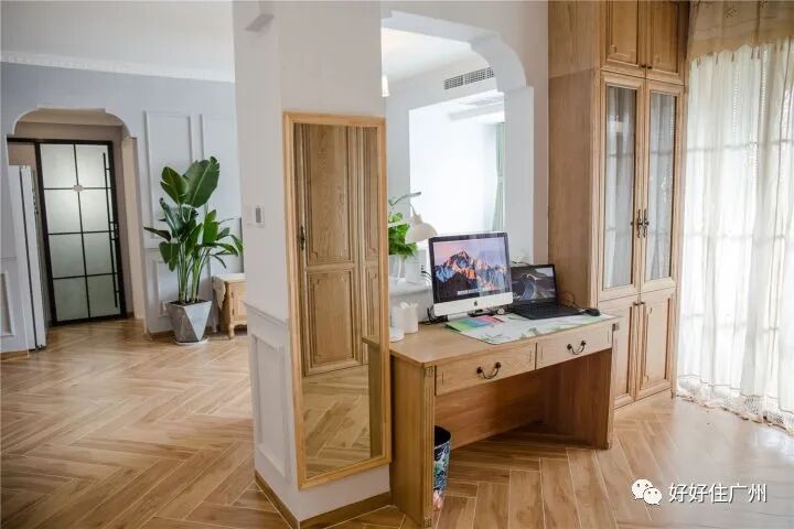 承重柱这一侧挂了穿衣镜,正对衣柜,实用,也让柱子不再光秃秃地显突兀。