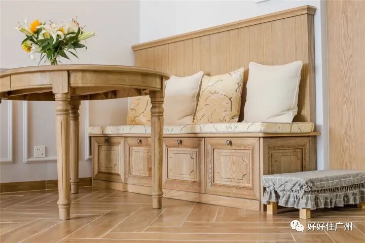卡座的板材和木蜡油工艺,都和玄关柜的一样,橡木黄色,很搭鹅黄印花的坐垫和抱枕。