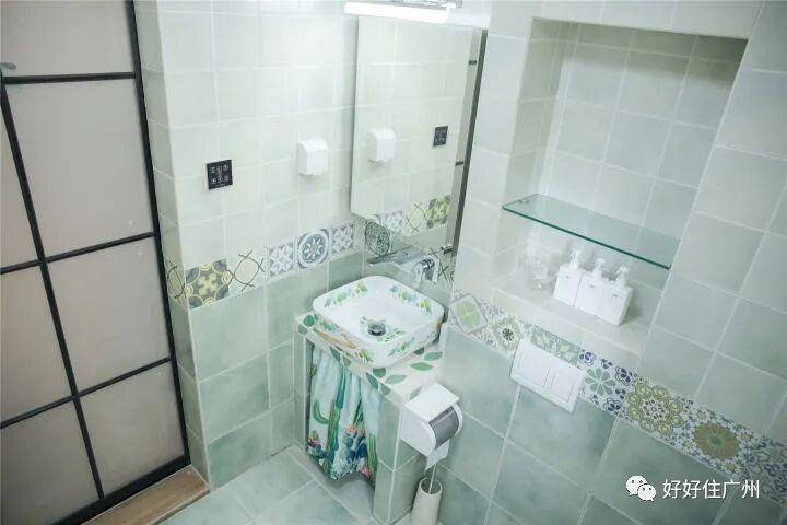 考虑到家里就两个人,次卫没必要过于「豪华」,于是将盥洗功能全部集中到湿区,并用磨砂玻璃门遮挡,门外干区放置冰箱,空间利用更高效合理。