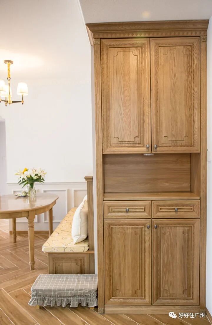 进门右手边沿墙打造顶天立地柜,柜体为多层板,面板为美国红橡实木。