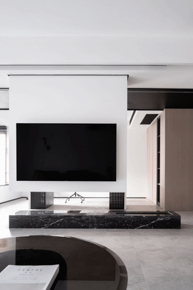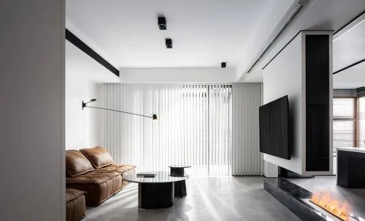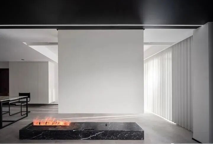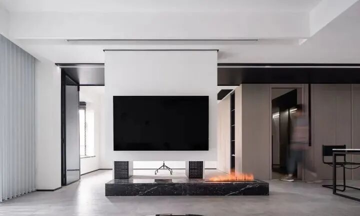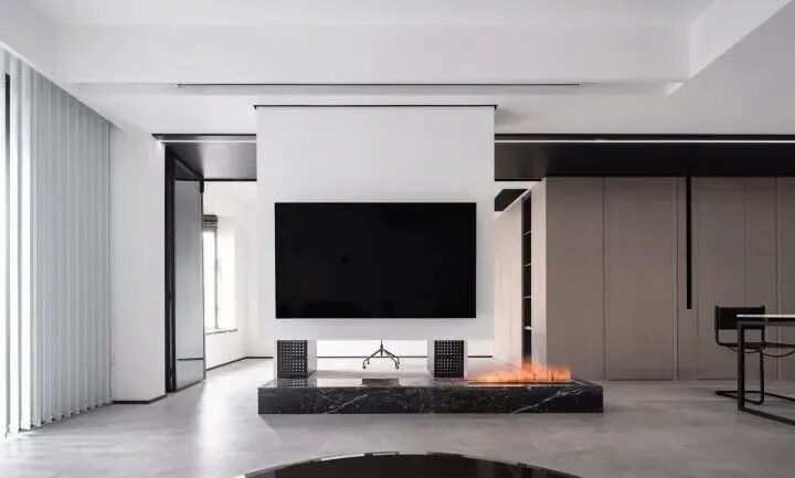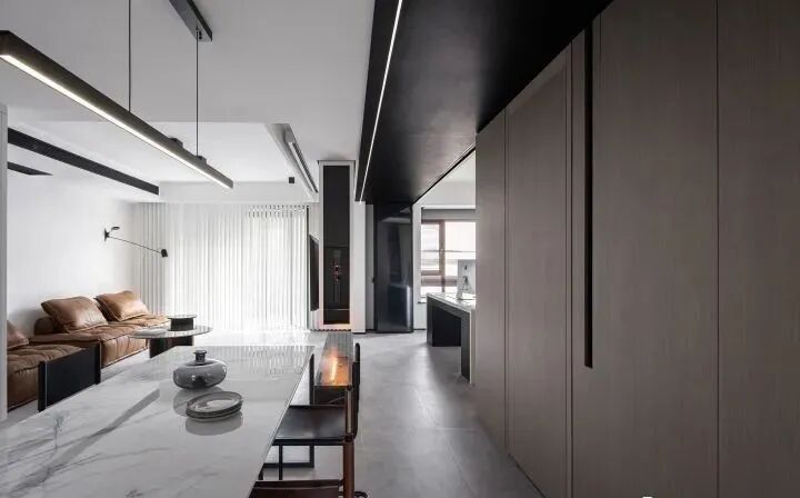 餐厅到客厅,视野连贯,电视不以实墙为背景,而是悬空的背景墙,