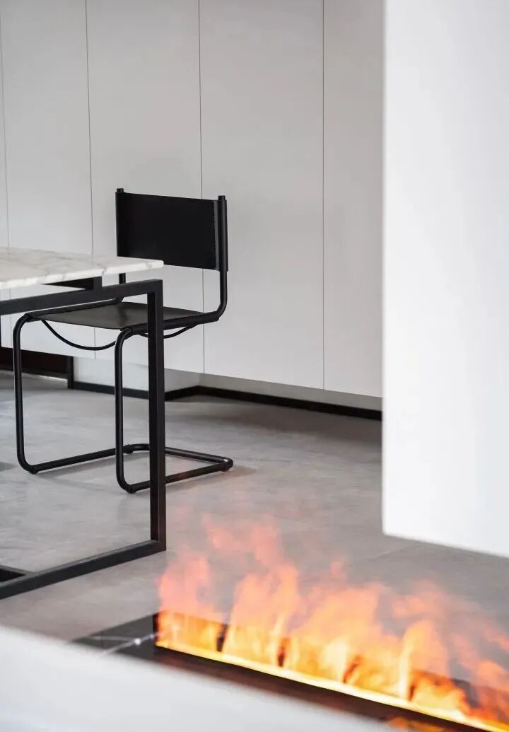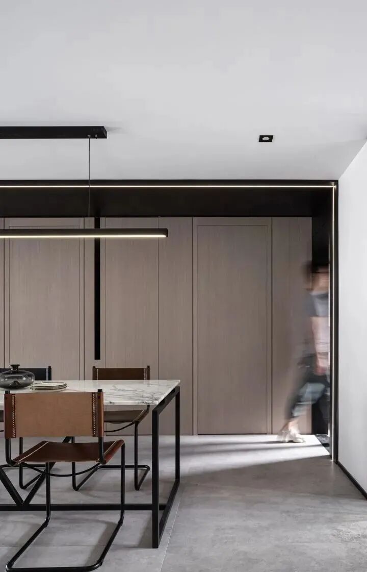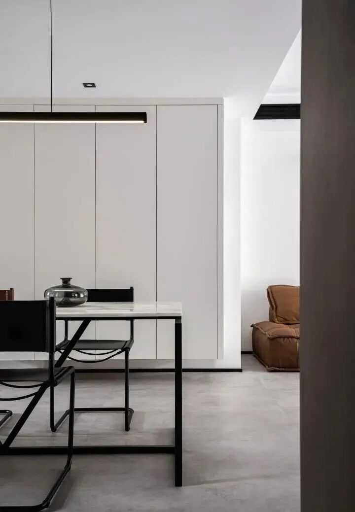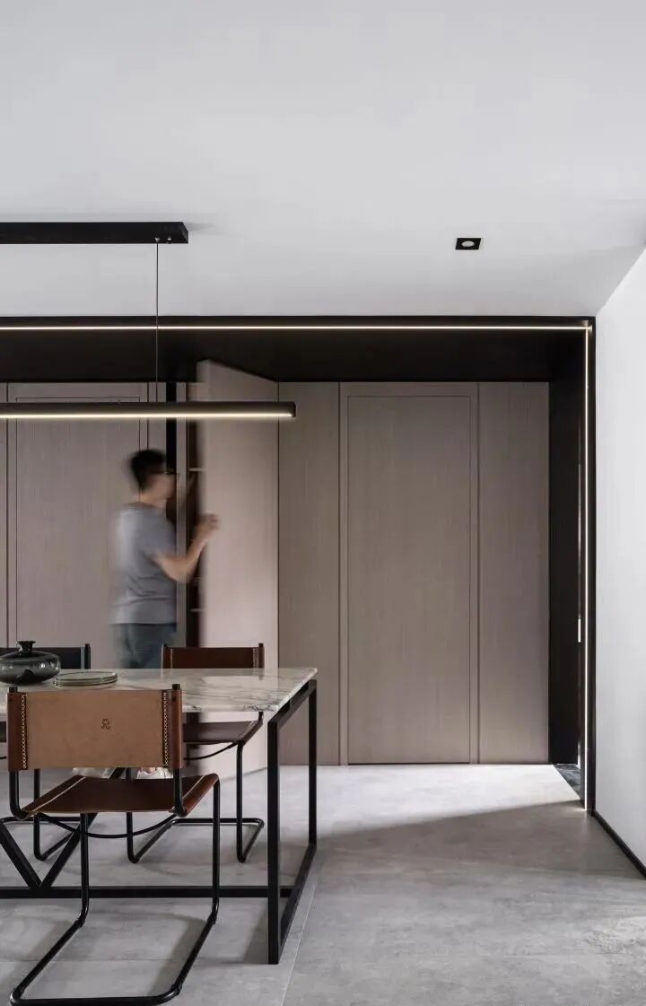 餐厅靠近入户处,沿墙面分布柜体,底部保留悬空的姿态。