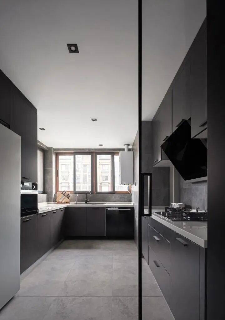 一入户,右手边就是厨房,纳入阳台后,操作范围宽绰,