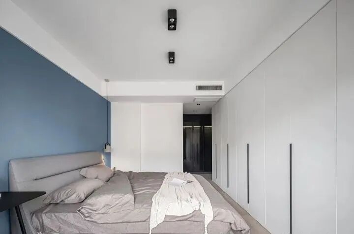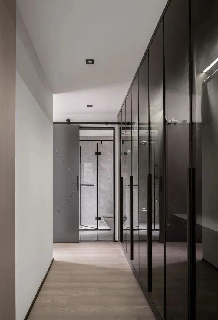 主卧内部通道的一侧被利用起来,做成带暗色玻璃门的衣柜,过道不会觉得压抑。