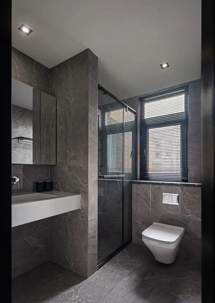 使台盆与淋浴区隔窄墙相邻,墙排马桶进一步节省空间。