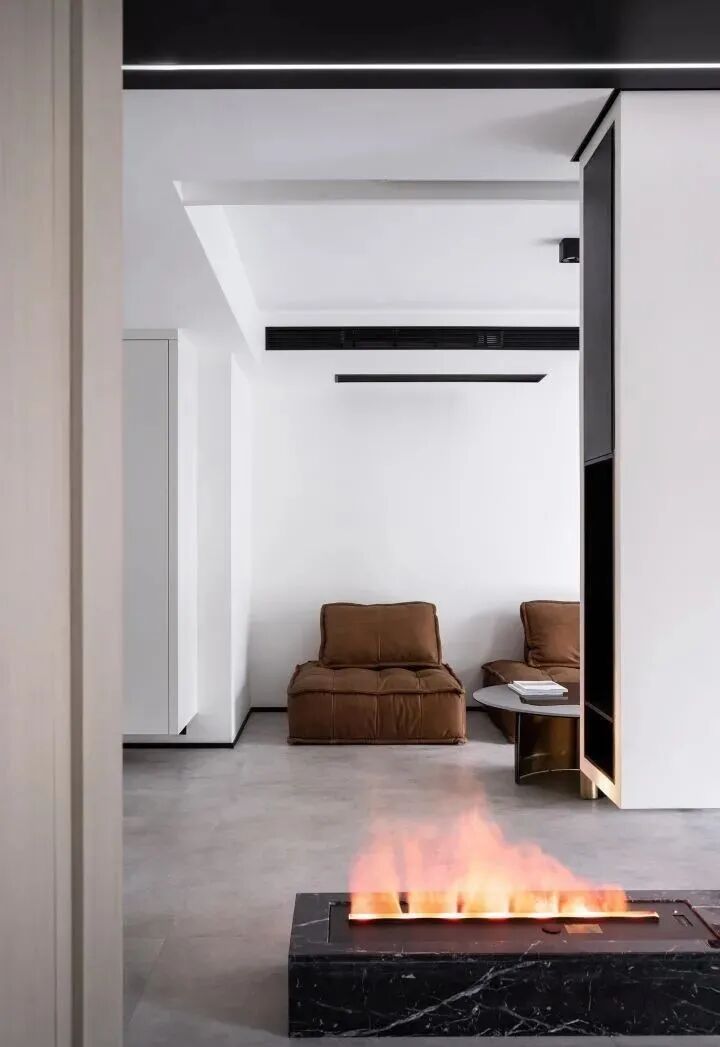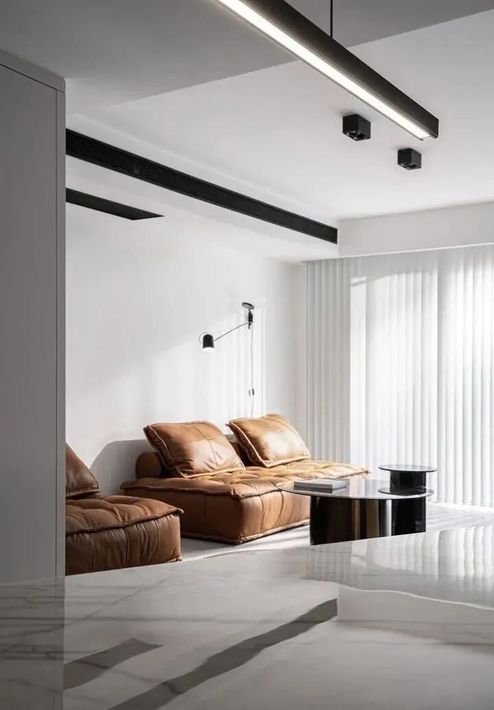棕色皮质沙发呈几何单元形态,堆砌自由,外形低矮坐深长,含有卧榻的影子。