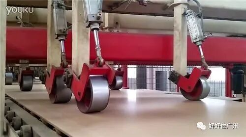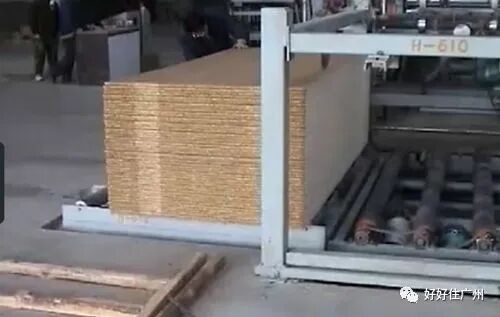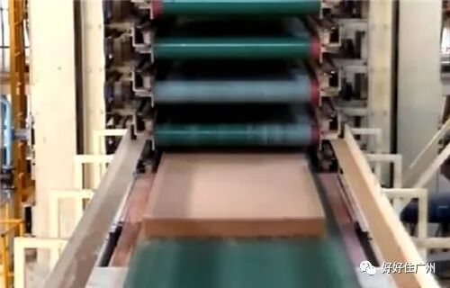 然后把厚板块送进多层吊笼,一层一块,在100多度的高温下热压,压力通常5兆帕, 就是5个压,把木粉末压紧实。